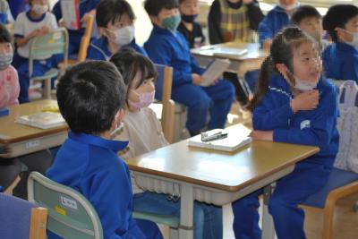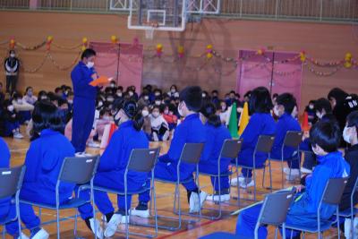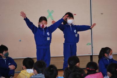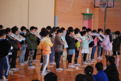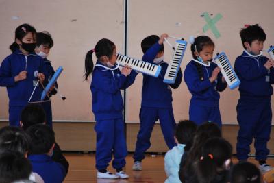 2月19日(金)今日の全校集会は、1・2年生の発表でした。1年生は「とんくるりん、ぱんくるりん」の歌と合奏を。2年生は「こぎつね」と「あのねのねずみは」の合奏と歌を発表しました。どちらも音楽の授業で学習した歌をかわいらしく披露してくれました。
