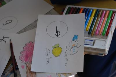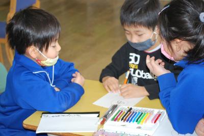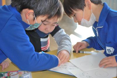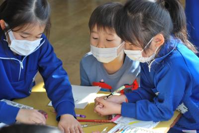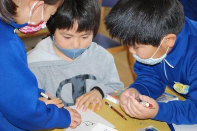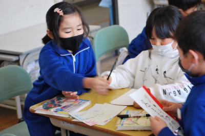 2月19日(金)2校時目に1年生と幼稚園児との交流授業がありました。多人数になるのを避けるため、1組と2組に幼稚園児が分かれて、小学校の授業を受けました。今日の授業は国語科です。自分の名前のひらがな文字から想像するものを絵に描いて本にします。(例えば、「と」→トマト、とんぼ)1年生がひらがなを丁寧に教えてくれていました。