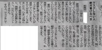 朝、教室を訪問すると5年生の女の子が、「校長先生○○君の投書が新聞に載っていました。」と教えてくれ、新聞切り抜きを見せてくれました。2月23日福島民報「みんなのひろば」に載っていました。本人に聞いてところ、「国語の意見文の勉強をしたので、出してみました。」とのこと。自分の意見を外に発信し、広く知ってもらうことは、よいことですね。