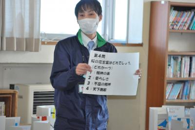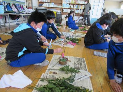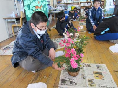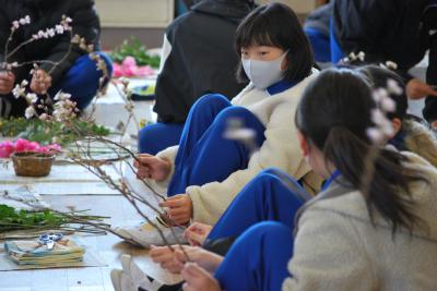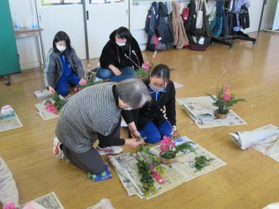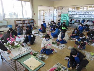 2月25日(木)3・4校時に6年生対象の「生け花教室」が開催されました。まずは、いつもお世話になっていますJAの田部さんから、植物や今回生ける花木についてのクイズが何問かあり、子どもたちの興味関心を高めていただきました。