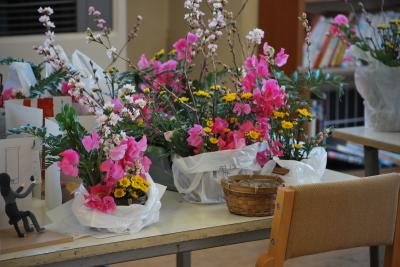 多目的ホールの机の上に飾られています。家に持ち帰って飾ってください。花のある生活いいですね。