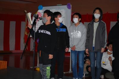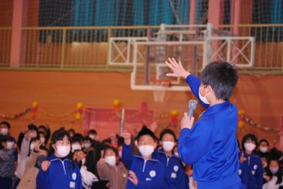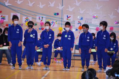 6年生男子6名の代表による感謝の言葉です。各学年それぞれに対して、企画運営して頑張ってくれた5年生に対して、先生方に対して感謝の言葉が述べられました。「6年生のために!」と頑張ったそれぞれの学年の子どもたちも、6年生から感謝の言葉をもらって、「やってよかった!」という思いを強くしました。