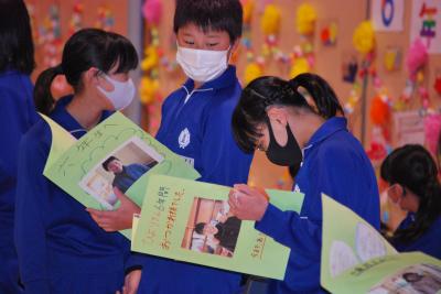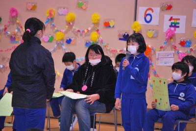そして、6年生一人一人へメッセージカードが贈られました。縦割り班のメンバーから言葉が寄せられています。「何て書いてあったの~」
