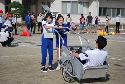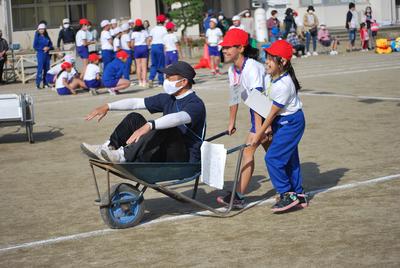事務の先生をリヤカーに乗せて。前が上がっちゃうよ。