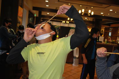 教頭先生と3人4脚。縛るのが大変。すぐに緩んで走り出せません~。