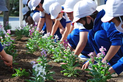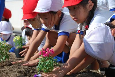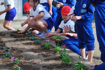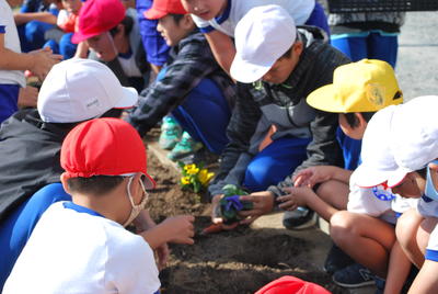 10月21日の昼休み、全校生で学年ごとに割り当てられた花壇に花苗(パンジー、ビオラ、ストック、金魚草、なでしこ)や球根(ベコニア、チューリップ)を植えました。園芸委員会が事前に勢いの衰えた花を引き抜き、肥料をまき、耕してくれました。子ども達は、「ここは私が植えたの」と、自分の植えた花苗の育ちに関心をもっています。春に一斉に花が咲き、美しい花壇になるのが楽しみです。