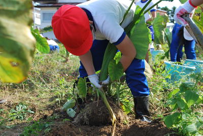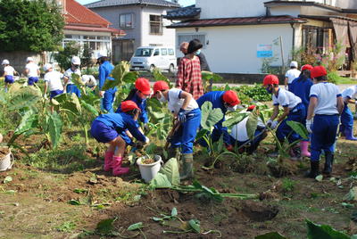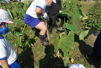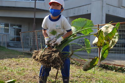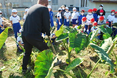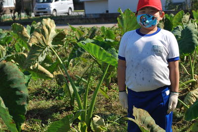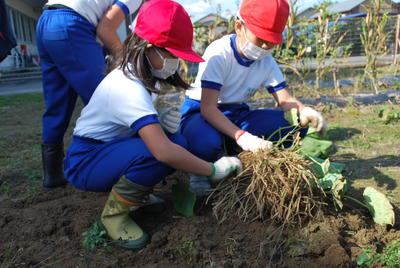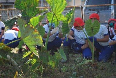 10月27日(火)3・4校時に3年生は、学校畑の相馬土垂の収穫をしました。6月2日に大野農園の菊地さんに教えていただき植えた苗が、とても大きな葉を広げています。