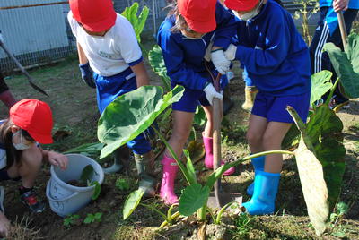 「根元すぐ近くにスコップを入れると、芋が切れてしまうかもしれないから、少し遠くのところにスコップを入れてね。