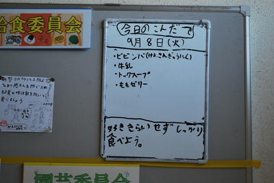 今日は気温と湿度が高く、熱中症危険度指数も上がったので、子ども達の校庭での遊びは中止になりました。子ども達の様子を見に行こうと階段をのぼると……階段の掲示板には給食委員会のコーナーがあります。今日のメニューは?