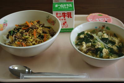 検食が届きました。「よ~く混ぜて食べてくださいね。」給食の方の言葉どおり、よ~く混ぜて食べました。汁がご飯にしみこんでとても美味しく、牛肉もしっかり味わいました。
