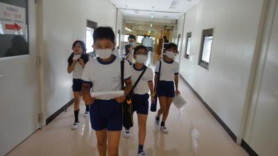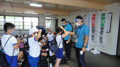 まずは、入り口近くで、全員の体温チェックを受けました。児童、引率者とも、全員平熱でした。