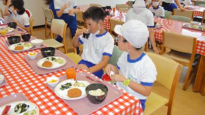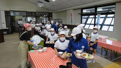 荷物を移動して、ベッドメイキングをした後は、早速昼食です。今年度は、感染症予防のため、バイキング形式ではなく、給食形式のおかずはワンプレートでした。「うわぁ~ごはんがおいしい!」との感想があちらこちらから。猪苗代産のお米だそうです。
