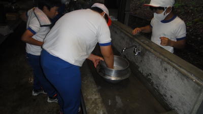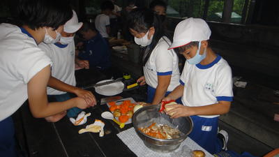 「野外炊飯」今晩の夕飯を自分たちで作ります。カレーライスを協力して、作ることができたかな。今回は、一人一人指示書を引いて、そこに書かれている内容を担当します。さぁ、包丁で野菜切れるかな!