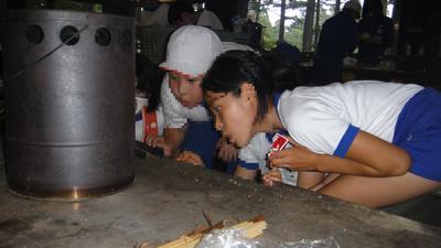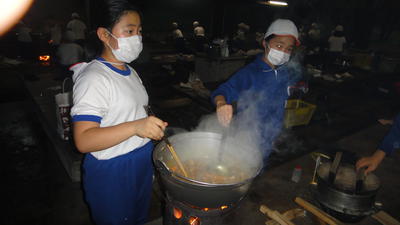 かまどの火起こしは、私たちの担当。うまくつくといいなあ。慎重に空気を送って。