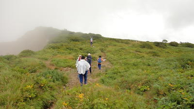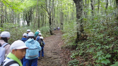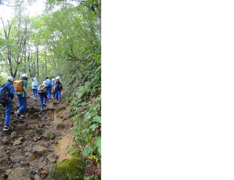 この宿泊活動のメイン=大きな活動「磐梯山登山」いよいよ開始です。前日は、雷や雨が降っていたのですが、当日朝は、薄曇りの天候でした。行けそうだ、天気予報とにらめっこ、ガイドさんのアドバイスを聞いて……よし登山チャレンジ!!さぁ、のぼりますよ!!