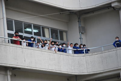 教室ベランダからの熱い応援も届いています。みんな校庭の様子が気になりますよね。