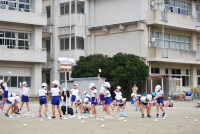 体育の学習で、玉を上手に投げることができるよう練習してきました。一所懸命かごに向かって投げますよ。