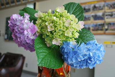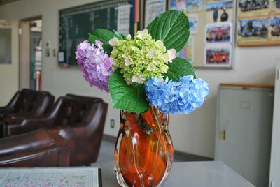 6月18日(木)朝、校長が各教室や幼稚園を廻って子どもたちと挨拶をしたり、話をしたりして、校長室に戻ってくると、校長室のテーブルの上に、花瓶に紫陽花の花が生けられていました。これは、高学年の男子が持ってきてくれて、生けてくれたものでした。校長室が一気に華やかになり、心が温かくなりました。その男の子の優しさにふれることができました。ありがとう!