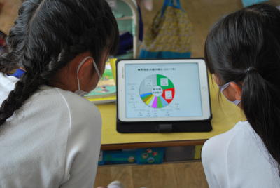 浜・中・会津地方それぞれの食べ物の特産物を調べました。浜…青のり、梨、相馬土垂、あさり等(海産物が多い) 中…いんげん、きゅうり、もも等(農作物が多い)会津…そば、ラーメン、こづゆ等(ほぞん食が多い)。タブレット端末を使ってさらに詳しく調べていきました。さぁ、何がわかった?