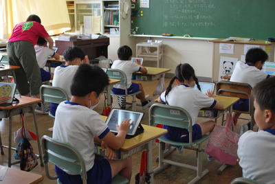 今日も朝からの雨、雨が降り止めばすぐにかわく自慢の校庭にも大きな水たまりがあちらこちらに。業間や昼休みは、校庭で元気に遊ぶことはできません。昼休みの校舎の中では、それぞれ思い思いに過ごす子どもの姿がありました。