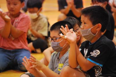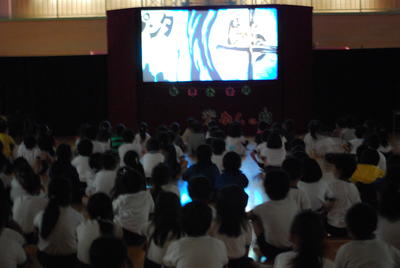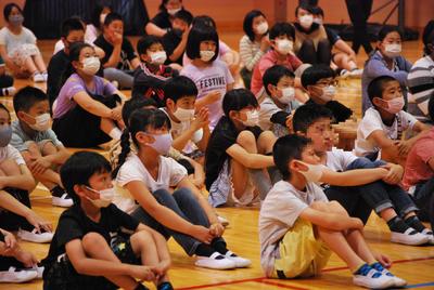 6月23日(火)体育館で鑑賞教室「影絵劇」を実施しました。新型コロナウイルス感染症対策として、幼・下学年と上学年の部に分け、三密を防ぎながらの観劇でした。「光と影が織り成すファンタジー世界」、語り手をミスターマジックの絶妙なかけ合いから繰り広げられる愉快なトークに、観ている誰もが影絵の世界に引き込まれていきました。子どもたち全員、影絵の世界にどっぷりと浸って楽しみました。