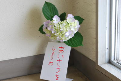 これも、階段の踊り場のところに、挨拶を促す紫陽花が。
