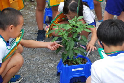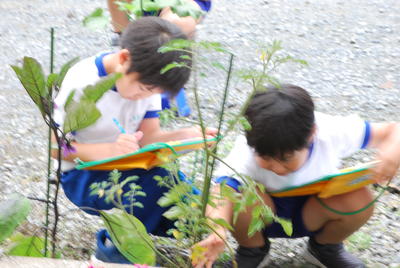 校長室から、ふと外を見ると、2年生が生活科で育てている野菜の観察をしていました。