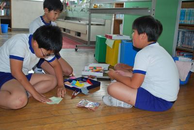 この時間を利用して、あいさつ運動で使う折り紙の作品をつくっておこう。