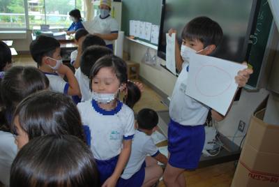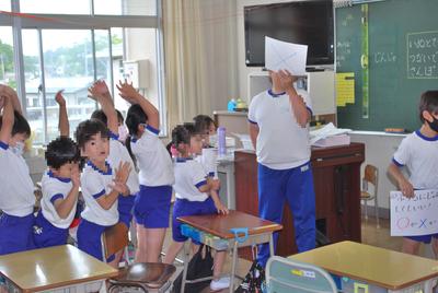 お昼休み、1年生と教室へ運動委員会の人が行って、プールに関係する○×クイズを出しました。楽しくプールのきまりを覚えることができたでしょう。プールに入れるのが楽しみです。