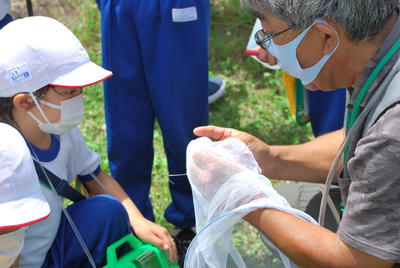捕まえた虫の名前を三田村先生に聞いています。