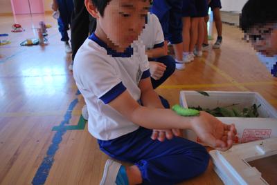 蚕の幼虫も持ってきてくださいました。「初めて見た~」「白いんだね」