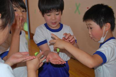 こちらでは、クラス全員でフルーツバスケット。「今日の朝、メロンを食べてきた人~!」さて、何人動くかな!