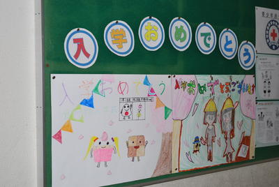 一年生の教室前の廊下の掲示板には、このようなポスターが。上級生が描いてくれました。心温まる掲示ですね。