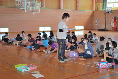 1組・2組合同で、配付プリントや持ち物の連絡を聞く5年生。