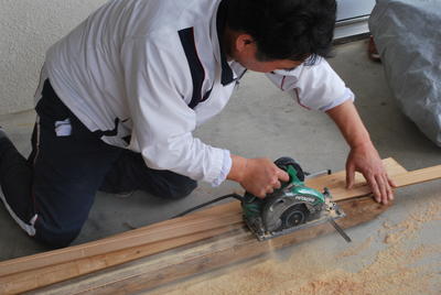 丸材を板材に取りつけて、耐水コンパネに取り付ける段取りを進めます。