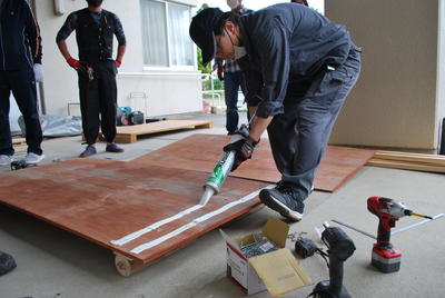 ボンドをつけて、2枚目の耐水コンパネを貼り合わせ、ねじどめをしました。