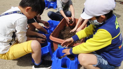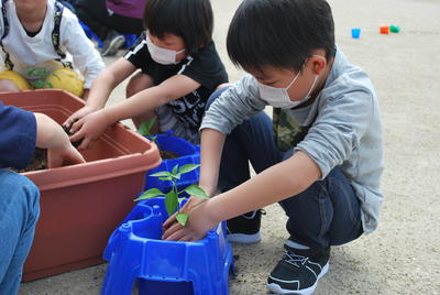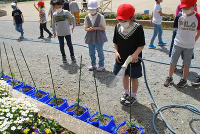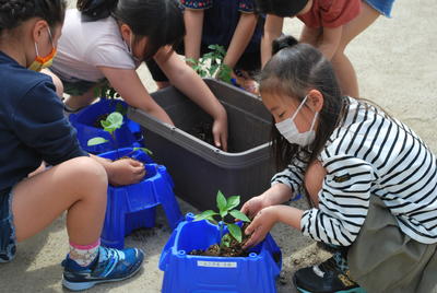 5月12日(火)2年生は生活科の学習で野菜の苗を植えました。JAの田部さんに今年度も来ていただき、「苗をふわふわの土のベット、布団に入れてあげよう。」「支柱に苗をきつく縛りつけてしまうと、苦しくて大きくなれないから、ゆったりと間をあけてしばってあげよう。」等、子どもたちにわかりやすい言葉で説明してくださいました。子どもたちは説明を聞きながら、朝顔の鉢に野菜苗を植えていきました。ミニトマト、ピーマン、パプリカ、オクラ、ナス等、自分の希望する苗をもらって、ふわふわの土の中に植えていきました。さぁ、自分で植えた野菜苗大きく育って収穫できるといいですね。