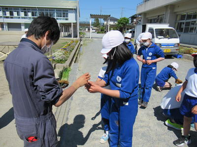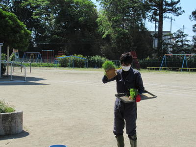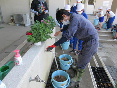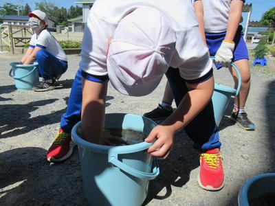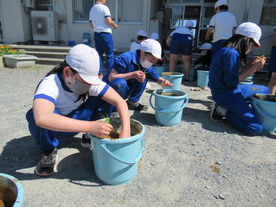5月29日の1・2校時、JAの田部さんのご指導のもと、5年生がバケツ稲に取り組みました。昨年は、天候不良のため、思ったような収穫はできませんでしたが、今年はどうでしょう?5月最終週のからっと晴れた青空を考えると、秋の収穫が楽しみになってきます。