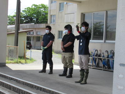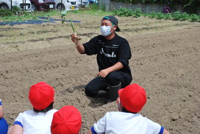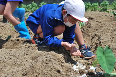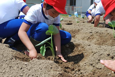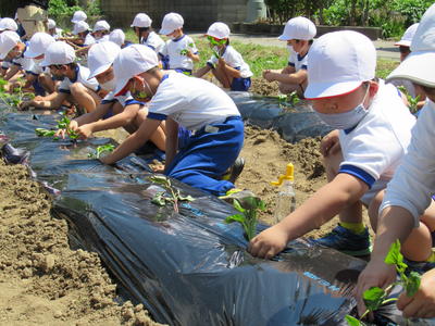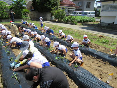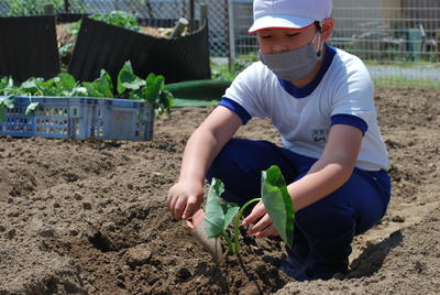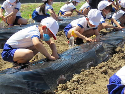 6月2日(火)JA田部さん他2名の方を講師にお迎えし、1年生はサツマイモの苗植えをしました。1列に並んで、マルチに穴をあけて、そこに一本ずつ丁寧に植えていきました。さて、どのくらい大きなサツマイモが収穫できるか楽しみです。