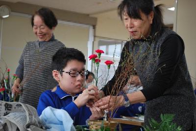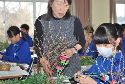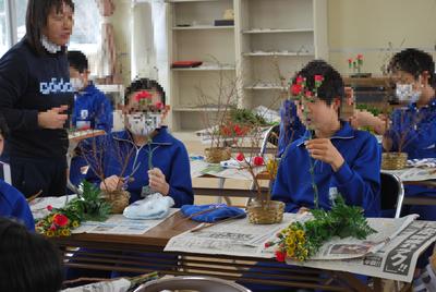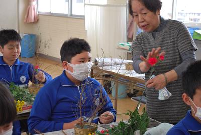 2月25日(火)6年生で生け花教室を実施しました。JAの田部さんにお世話になりながら、当日はお二人の講師の先生をお招きし、基礎から教えていただきました。始めにいける枝、次にいける花など高さや角度に気を配りながらオリジナルの作品をつくっていきました。同じ材料を使っていながらも、やはり個性は光るものです。しばらく、6年生教室前に飾っています。