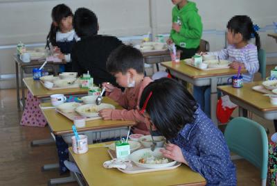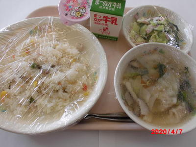 4月7日(火)本日から給食の始まりです。1年生も入学してから初の給食を食べました。今日のメニューは、チキンピラフ・ワンタンスープ・春キャベツのサラダ・ゼリー・牛乳でした。