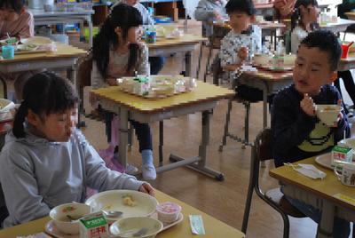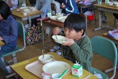 さあ、初給食!どうだったでしょうね~。「このサラダおいしい!」「見て、ピラフ全部食べられたよ」などの声がたくさん出ていました。幼稚園の時のお弁当と比べると、給食で食べる量は多くなっていますね。たくさん運動して、いっぱい食べてくださいね。
