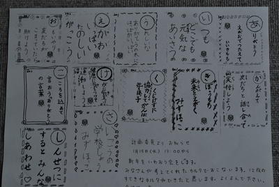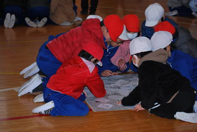 校長先生のお話の後、全校生が18班に分かれて、紅白対抗の「みずほっ子 カルタ大会」を実施しました。カルタ札の読み句は、それぞれの学級で2学期中に考えていました。