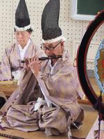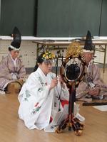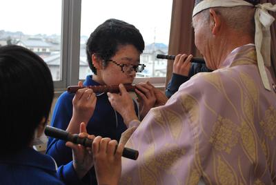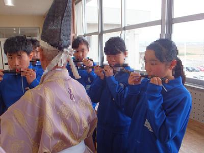 1月23日(木)視聴覚室で相馬雅楽会の方々をお招きしての「雅楽教室」を開催しました。普段あまり耳にすることのない高貴な調べを聴くことができました。「この音は「天」を表します」と説明を受けた後で、聴いてみるとなるほどそのようにきこえてくるので不思議です。「大地」を表す音は、やはり力強い感じにきこえます。衣装もみなさん揃えて来てくださったので、異なる世界へ入っていったようでした。