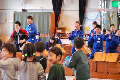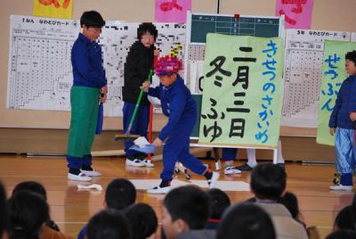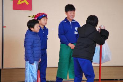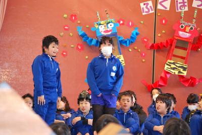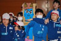 2月3日節分の日に、5年生が幼稚園に行って豆まき会の交流をしました。幼稚園児に「おふくとおに」という劇を見せ、代表の2人が、追い出したい鬼の発表をしました。幼稚園児は一人一人発表しました。