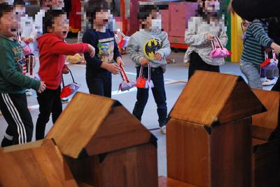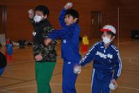 さあ、次はお楽しみ「豆まきゲーム」です。鬼に自分たちでつくった、ソフトボール大の豆を鬼にぶっつけます。鬼の下にあるかごに何個入るかを班で競い合います。6年生チームの優勝でした。おめでとう!
