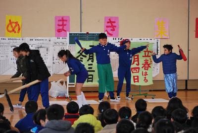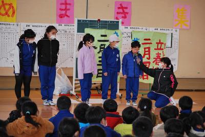 2月3日(月)節分です。業間の時間に全校生で「豆まき集会」を行いました。計画委員会が中心となって準備、運営をしてくれました。始めに、各学年の代表が自分の中の追い出したい鬼を発表しました。