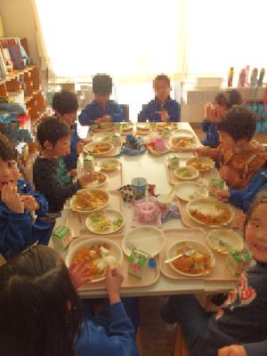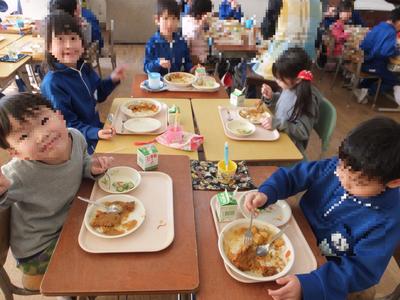 2月18日(火)幼稚園との交流給食がありました。飯豊幼稚園の年長児さんが、1年生の教室にきて、一緒に給食を食べました。この日の給食メニューは」カレーライスとサラダでした。幼稚園児には量が多いかなと思いましたが、みんな、パクパク「おいしいね!」と言いながら食べていました。迎える1年生も、一緒に食べることができて嬉しそうでした。4月の入学待っているからね~!