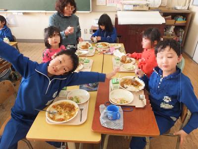 2020年2月20日 09時05分2月18日(火)幼稚園との交流給食がありました。飯豊幼稚園の年長児さんが、1年生の教室にきて、一緒に給食を食べました。この日の給食メニューは」カレーライスとサラダでした。幼稚園児には量が多いかなと思いましたが、みんな、パクパク「おいしいね!」と言いながら食べていました。迎える1年生も、一緒に食べることができて嬉しそうでした。4月の入学待っているからね~!