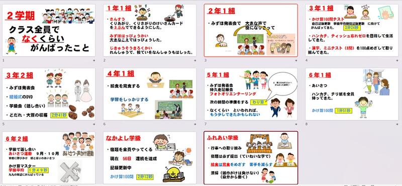 各クラスで、がんばったことを教えてもらい、パワーポイントにまとめたものです。